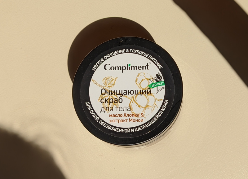Выбрала очищающий скраб для тела от российского бренда Compliment с маслом хлопка и экстрактом Монои, именно его состав "ECO BEST" меня зацепил.