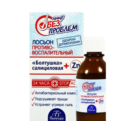 Лосьон противовоспалительный "Болтушка салициловая+Zn", Floresan, предназначен для устранения угревой сыпи. В составе средства содержится антибактериальный комплекс, который подсушивает прыщи и сужает поры. Лосьон одобрен дерматологами.
